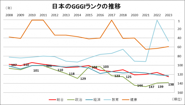 日本の総合ランクは、スコア、順位ともにほぼ横ばいとなっています。国際的にみると、政治分野、経済分野において日本以上に制度が整備された諸外国が指数を上げることによって相対的に日本の順位が落ちていると考えます。