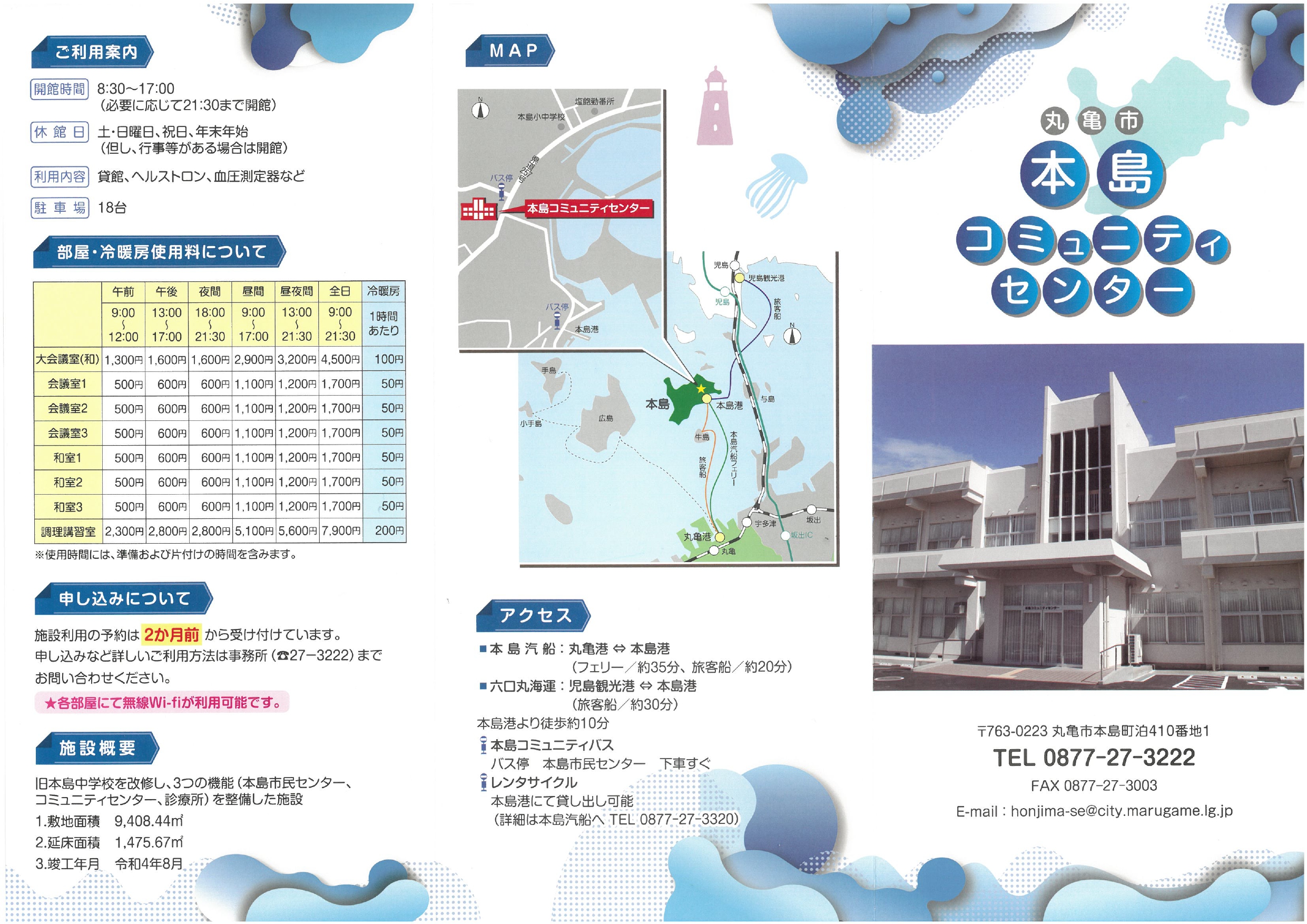 本島コミュニティセンターは本島地区住民の地域活動の拠点として、会議や講習会をはじめ、クラブ活動や料理教室など様々な行事に幅広く利用されています。地域の皆さまのふれあい、また、来島者の方々との交流の場としてぜひご利用下さい。